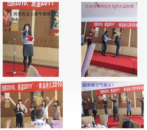借著本次年終會的機會,持久想告訴大家:“回顧2010,感謝你們堅定相隨,與持久攜手并肩”“展望2011,期冀我們不離不棄,與持久共同成長”本次年終會以各種舞蹈歌曲、小品相聲和抽獎等形式出現(xiàn),同時節(jié)目進行評選和頒獎。同時公布2011年青島持久碳業(yè)有限公司的人事任命。持久總經(jīng)理的任命,是持久2011年的頭等大事。相信在總經(jīng)理周明明的帶領(lǐng)下,持久會有更美好的明天。